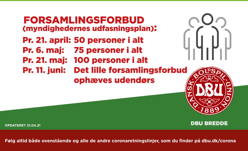 Forsamlingsloftet hæves fra torsdag den 6. maj 2021 til 75 personer ved udendørs arrangementer. Både spillere, trænere, dommere, andre officials og evt. tilskuere mv. tæller med i det samlede antal, der må være forsamlet i forbindelse med en fodboldkamp.