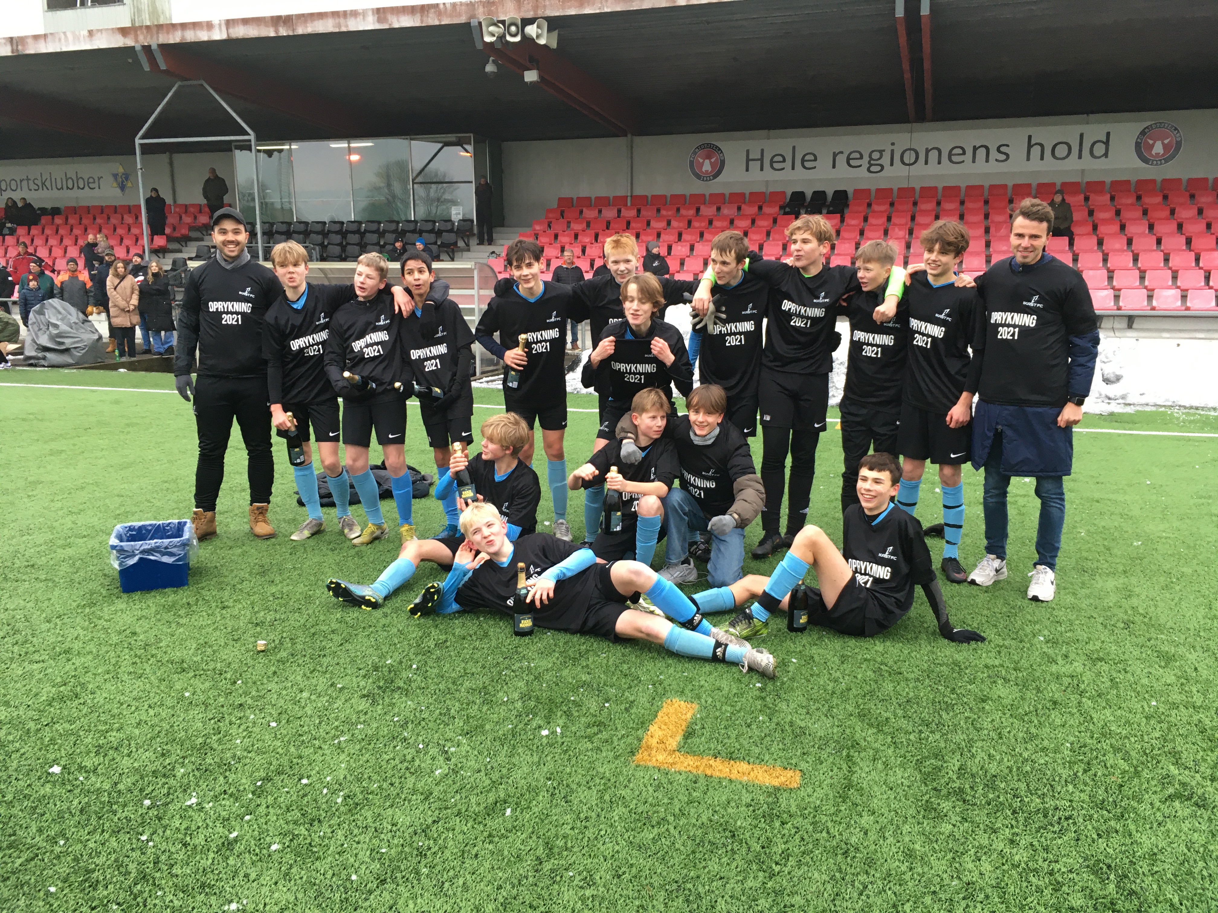 Der blev udleveret Faxe Kondi Champagne og opryknings-T-shirts, og mens propperne sprang blev det helt store holdfoto taget. Herefter fulgte årets længste bad, trænere under bruseren og i aften afslutnings- og OPRYKNINGSFEST!
