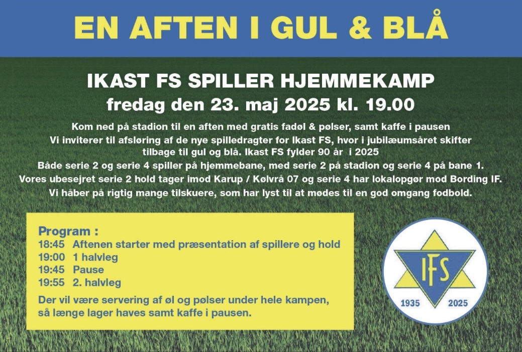 På selve kampaftenen er klubben i samarbejde med Danish Crown og Royal Unibrew vært ved en gratis pølse og øl - som kom på EDC Arena og få en god oplevelse samt en sejr over Karup/Kølvrå 07. Kom meget gerne i festlige gule og blå farver!